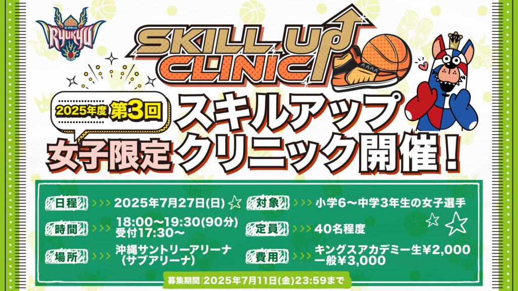この度、琉球ゴールデンキングスアカデミーでは7月27日(日)に「2025年度 第3回 女子限定スキルアップクリニック」を開催いたします。