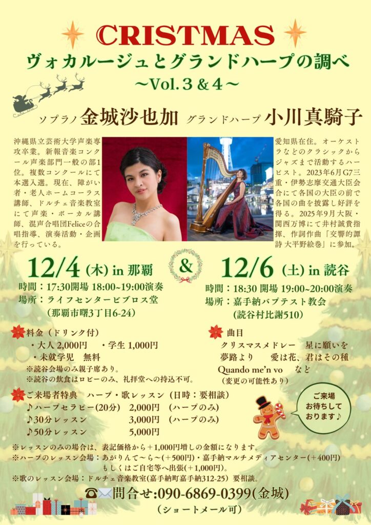 お得なハープ/歌レッスン(日時:要相談。ハープは12/5〜7)
