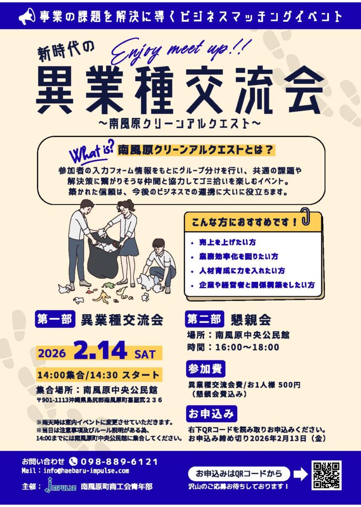 クリーンアルクエストは、沖縄県南風原町で開催する、ゴミ拾いをしながら地域にある企業をクイズ形式でめぐる体験型の異業種交流イベントです。チームで協力して“街のミッション”に挑戦することで自然に会話が生まれ、南風原町の企業やまちの魅力を再発見できます。まちをキレイにしながら、人と人のつながりも育てる新しい交流会です。