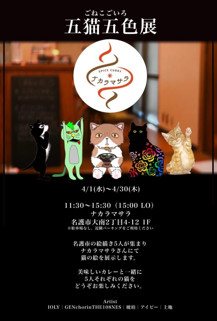 名護市にあるカレー屋さんナカラマサラにて、名護市で活動する5人の絵描きが猫の絵を展示し、
