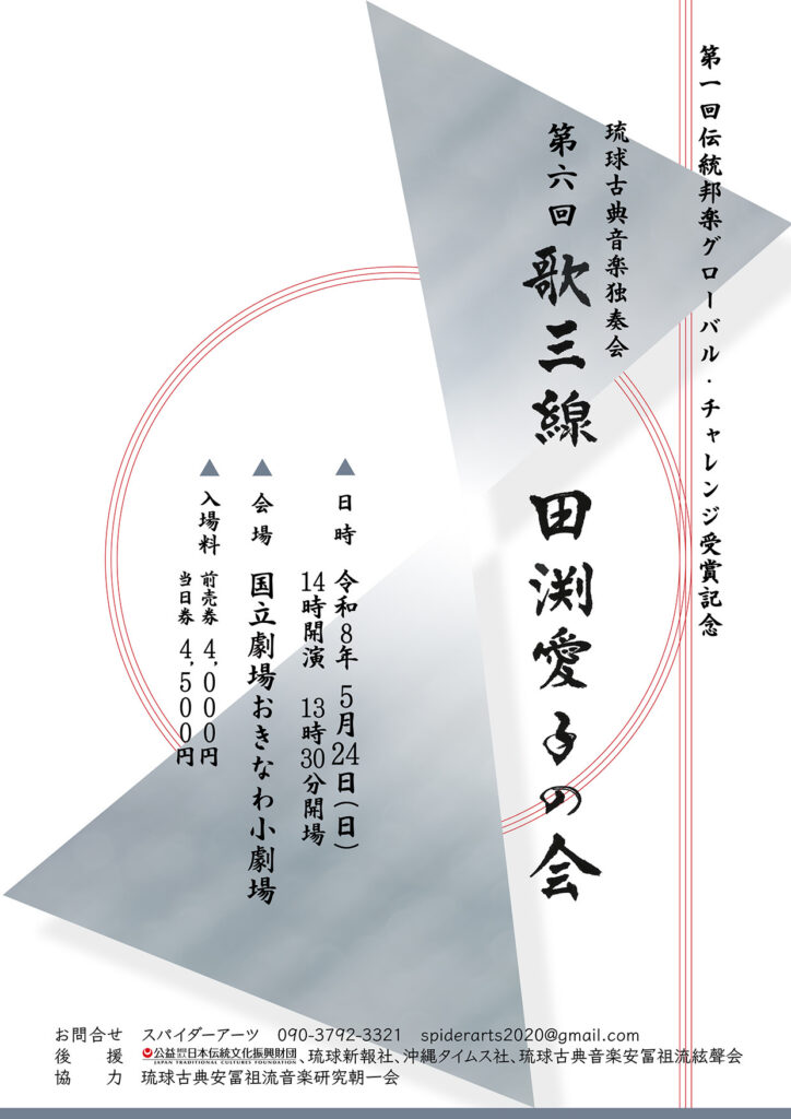 琉球古典音楽歌三線奏者田渕愛子のリサイタル。この度での演奏会では、第1回伝統邦楽グローバル・チャレンジ受賞を記念し、琉球古典音楽の名曲「昔蝶節」「二揚 仲風節」などを演奏する。